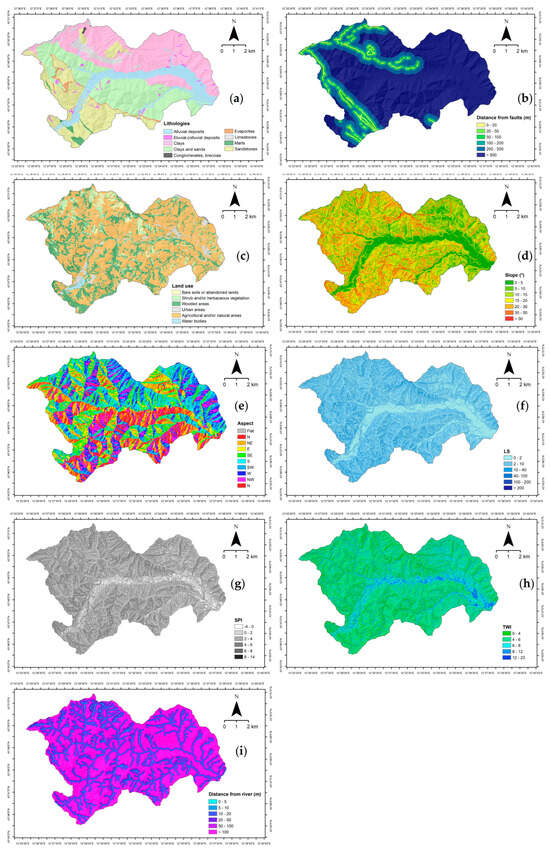 Maps of the predisposing factors considered to predict the badland susceptibility. (a) Lithological map. (b) Distance from faults. (c) Land use. (d) Slope. (e) Aspect. (f) Length slope factor. (g) Stream power index. (h) Topographic wetness index. (i) Distance from rivers.