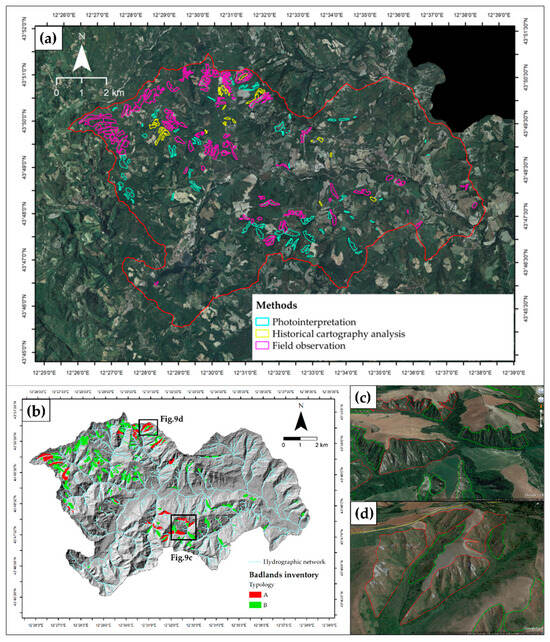 These data were also associated with pluviometric records to analyze the areal evolution of the badland forms in relation to major rainfall events. Then, the collected data were categorized in the GIS system according to (i) the classification proposed by Moretti and Rodolfi [23,52] and (ii) the mapping method used (i.e., field observations, the historical inventory of the Marche Region, and aerial/satellite photos).