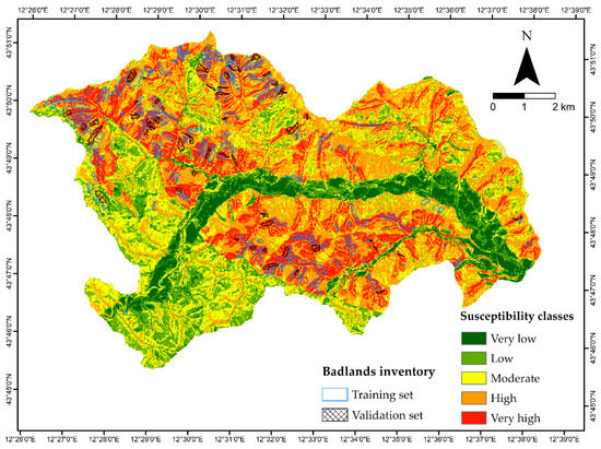 Finally, the susceptibility map was validated by comparing the predicted susceptibility classes with the badlands of the validation set of the inventory. The susceptibility map is classified into five susceptibility classes using the natural breaks classification method [54] and an inspection of the total number of badlands for each susceptibility class is performed.