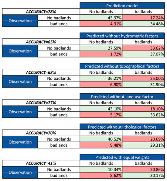 In this case, the validation dataset also includes additional random points of no badlands locations. This approach is exploited to verify the overestimation of the developed susceptibility map. The results give insight into the role of the selected variables and the higher accuracy of the proposed prediction model that reaches values of 78%. The lower accuracy (41%) is observed considering equal weight to all variables (Figure 13). This evidence confirms the reliability of susceptibility mapping.