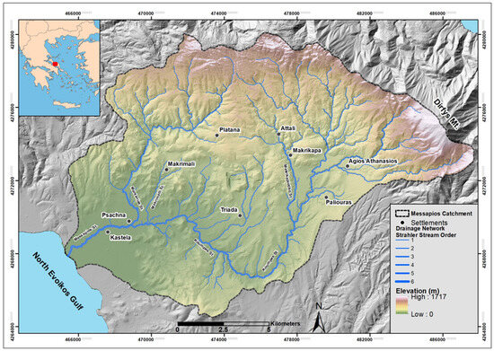 The Messapios River is an ephemeral stream located in the central part of Evia Island, Greece. The total length of its main channel is approximately 34 km. For the first 18 km, it flows in a northeast-to-southwest direction, then shifts to a southeast-to-northwest flow for the next 9 km. In its final stretch of 7 km, before emptying into the North Evoikos Gulf, it resumes a southeast-to-northwest flow. The Messapios River catchment covers a total area of 215.96 km2 and is surrounded by high mountains characterized by steep slopes and rugged relief. It reaches a maximum elevation of 1743 m at its northeastern boundary, on the western slopes of Mount Dirfys (Figure 1). The average slope of the catchment is 24.1%, with the steepest relief found in the upstream mountainous and semi-mountainous regions to the north and northeast, favoring surface runoff. In contrast, the lowland area of the extensive fan delta at the river’s mouth is characterized by gentle slopes, which promote sediment deposition and enhance rainwater infiltration.