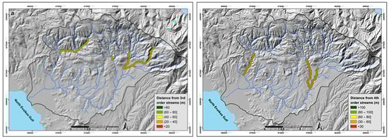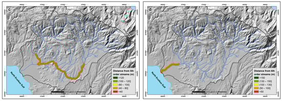 Thematic maps showing the spatial distribution of the “distance from stream channels” criterion for 3rd order (a), 4th order (b), 5th order (c), and 6th order (d) streams. The Distances categories were classified into five groups, as shown in Table 4.