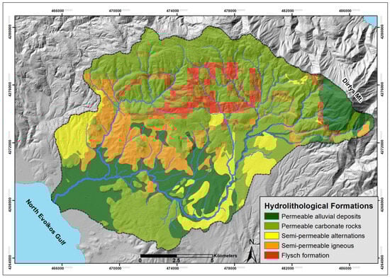 The geological formations within a catchment can act as either a deterrent to or a catalyst for flood events. Depending on their hydrogeological characteristics, they influence surface runoff and the infiltration of rainfall with permeable formations, enhancing infiltration and impermeable rocks, increasing surface runoff. The geological formations of the catchment were obtained from the 1:50,000 geological map provided by the Institute of Geology & Mineral Exploration of Greece [37] and were categorized into five groups based on their permeability.