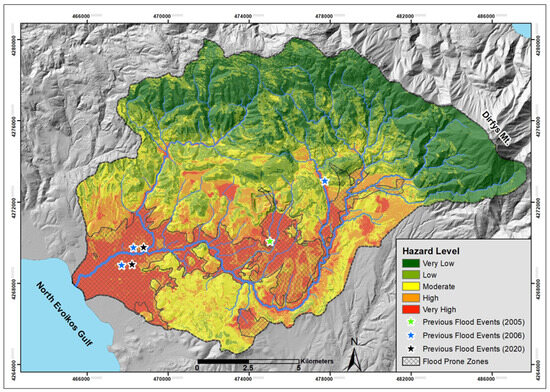 The flood-hazard assessment map is a valuable tool for regional land-use planning, enabling the identification of areas suitable or unsuitable for urban development [59,60]. While hazard maps reflect the current state of flood risk across the catchment, they offer invaluable insights that can guide long-term policymaking and future planning. This is especially critical for the study area, where land cover is continuously changing, primarily due to the devastating impact of wildfires that have ravaged a significant part of the catchment’s forests.