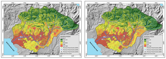 Maps showing the flood-hazard level distribution results based on sensitivity analysis for Scenario 1 (a) and Scenario 2 (b).