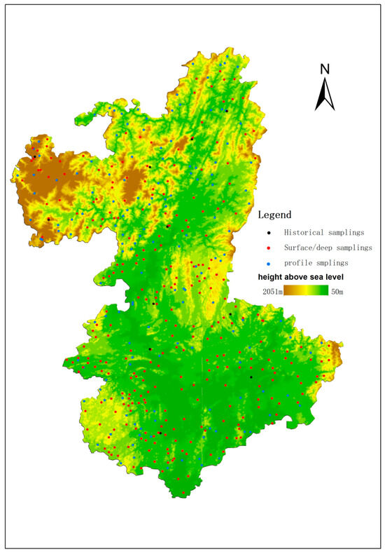 This article compiles historical data from the study area, including soil sample data from two periods, 1990 and 2010 (a total of 11 sampling points), and soil samples were collected at the same points in 2020. The sampling in this study was sourced from the Special Investigation on Soil Environmental Background Values Project, the historical samplings from the local environmental protection agency, and the sampling and testing methods are consistent with the project. A total of 2588 soil samples were collected, including 290 samples from the surface and subsoil layers, comprising 580 soil samples; 150 profile sampling points were established, yielding 1897 profile soil samples. Additionally, 31 bedrock samples were collected, totaling 2619 samples, including the previous 11 sampling points (Figure 1).