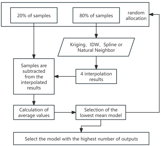 Step 1: Randomly select 20% of the points within the research area as validation points, with the remaining 80% of points used as sample points for interpolation. Only 20% of the data points were used for validation to ensure that more than 30 points are included in the model calculations, in order to meet the minimum statistical requirements.