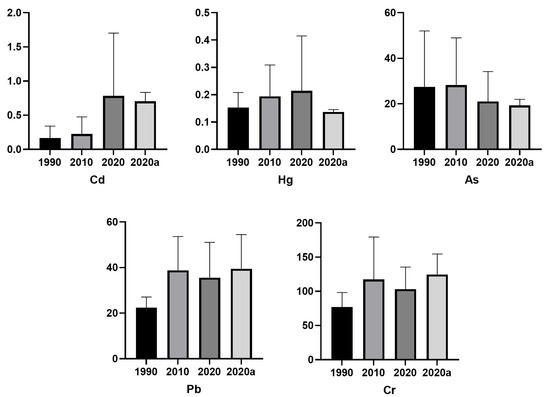 The variation in Hg content remains relatively stable, with a decrease of 29% in the 2020a data compared to the 1990 data and an increase of 39% compared to the 2020 data, indicating an overall stability in soil Hg content across the entire area, but with a significant increase in local variability. As, Pb, and Cr show a trend of initial increase followed by a decrease at the same sampling points. As it has remained relatively stable in the first 20 years, considering the significant differences between the previous sampling and testing errors and the 2020 data, the source of the initial change is difficult to determine. The 2020 and 2020a data show decreases of 24% and 31%, respectively; spatial analysis based on GIS also does not reveal any significant changes. However, in the 2020a data, their variance and standard deviation are consistent with those of 1990 and 2010, indicating that the variation in their differences may be due to spatial variability rather than a general trend. Pb and Cr show consistent changes, with increases of 72% and 52%, respectively, from 1990 to 2010, and decreases of 9% and 12%, respectively, from 2010 to 2020; the overall situation in 2020a was essentially consistent with that of 2010. Wang [34] also observed similar changes in the Yangtze River.