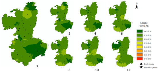 The optimal spatial interpolation method for Hg based on geostatistics is IDW (Inverse Distance Weighting model), with a model accuracy of up to 72%, which was generally associated with low Hg content. The Hg content in the research area was generally below 0.3 mg/kg, with most of the Hg content falling within the range of no environmental risk, except for a few individual points. The northern part of the area had a content ranging from 0.2 to 0.3 mg/kg, while the southeastern part was below 0.1 mg/kg, and the rest of the area was mostly between 0.1 and 0.2 mg/kg (Figure 5).