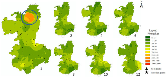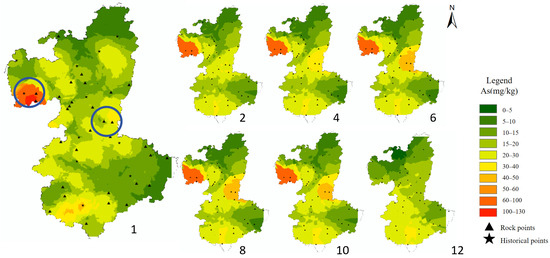 Combining the analysis of multiple time points, it can be seen that the average As content decreased by 24% over 30 years (pentagram points in the figure). Two points are located in the red and yellow areas. Combined with the results of As accumulation analysis, it was known that non-accumulated points account for 95.0%, mild accumulation accounts for 4.3%, and moderate accumulation accounts for 0.7%. This indicates that the As content in each soil layer was relatively consistent, but there are still some areas where the surface content was high and the deep content was low. For example, in the northwest corner of the study area, the content was basically normal at 240 cm, while the high-value area slightly east of the center only exists in the 80–180 cm soil layer. As content tends to increase as you go deeper in some areas, mainly concentrated in the green areas in the central and southern parts of the study area, which is mainly influenced by geological factors.