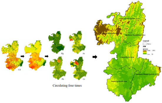 This study employs MSN model principle and GIS overlay to divide the units. The interpolated surface content of each metal is treated as a layer of factors. Within each layer, several small, uniform surfaces are differentiated based on the color band division described in Section 3.3. The boundaries of the units follow township boundaries. After unit division, a comparative analysis is conducted based on the variance of the content of each unit point. The main steps are as follows: Classify the spatial interpolation results of the surface content of the five metals as the basis for unit differentiation, focusing on three main color series: green, yellow, and red. For Cd, the spatial interpolation results are used to divide the units based on township boundaries. On the basis of Cd division, consider the spatial interpolation results of Hg to divide the units along township boundaries. Successively consider the adjustment of As, Pb, and Cr to the boundaries and units. The specific division is shown in Figure 9 below.