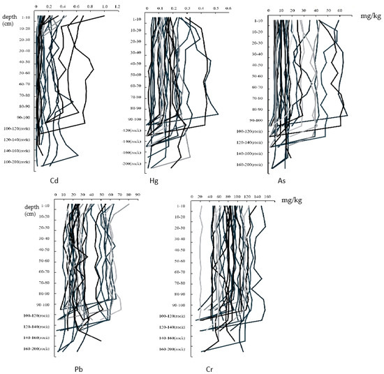 Regarding the Profile samplings content, single-point profile content analysis was conducted for 31 bedrock samples (triangular markers in Figure 4, Figure 5, Figure 6, Figure 7 and Figure 8, collected in 2020), which facilitates further summarization of the variation trends of the five metals. These points are distributed throughout the study area, essentially reflecting the overall profile variation trend (Figure 10).