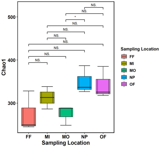 Beta diversity is represented by a principal coordinate analysis. This distance between points in the plot represents the similarity of species composition between the different points (sampling locations). A shorter distance between points represents higher similarity. MO—organic management; MI—conventional management; NP—natural pasture; FF—foliage management; OF—open field. (Significance differences: * < 0.05; NS—Non-Significant).
