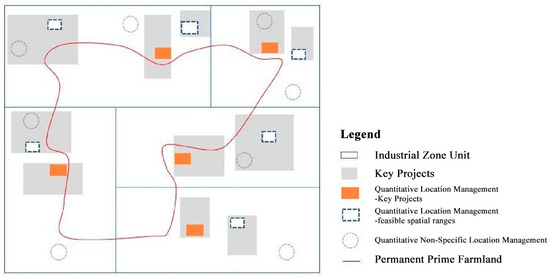 - The fourth initiative regards the establishment of a dual management model that combines rigidity and flexibility for facility agricultural land (Figure 5). The difference between the supply and demand for facility agricultural land is a major factor limiting the development of facility agriculture. On the one hand, it is essential to leverage idle residential and other nonagricultural lands and to develop mechanisms to reactivate and utilize existing idle facility agricultural land to increase its availability. On the other hand, it is necessary to manage the conflicts related to farmland preservation, ecological protection, and facility agricultural land expansion. Facility agricultural land typically exhibits a scattered, point-like distribution with specific effective service radii. In crop cultivation, particularly large-scale grain production, sites often occur close to farmland, leading to potential encroachment on permanent basic farmland. Additionally, when new facility agricultural land is sited away from farmland, it is generally located in ecologically fragile areas such as grasslands, forests, or wetlands, which is at odds with the goal of green and high-quality development. Planning strategies are crucial for addressing these conflicts. Nonetheless, conflicts between facility agricultural land planning and the location preferences of land users are inevitable. To address this problem, a model of flexible management and control of facility agricultural land based on national land spatial planning and land-use control requirements was investigated, adopting industrial areas as units and implementing a dual management method of quantitative positioning and quantitative non-positioning.