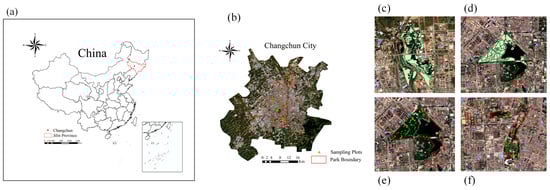 (a) The study area in Changchun, Jilin Province, China; (b) plots in 29 urban parks; (c) green spaces patches in North Lake Wetland Park; (d) green spaces patches in South Lake Park; (e) plots in South Lake Park, and (f) plots in Changchun Park, Forest Park, and Tianjia Park.