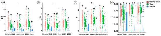 Species diversity attributes of woody plants, trees and shrubs in different construction periods in urban parks. (a) Species Richness (SR), (b) Margalef richness index (dMa), (c) Shannon–Wiener diversity Index (H′), and (d) Pielou Evenness index (J′). Mean values sharing different letters are significantly different (p < 0.05), and mean values sharing the same letters are not significantly different (p > 0.05).