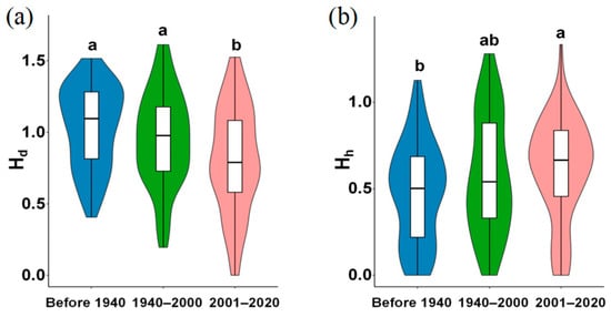 Structural diversity attributes for different construction periods in urban parks. (a) DBH diversity index (Hd), (b) Height diversity index (Hh). Mean values sharing different letters are significantly different (p < 0.05), and mean values sharing the same letters are not significantly different (p > 0.05).