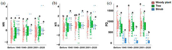 Phylogenetic diversity attributes of woody plants, trees, and shrubs for different construction periods in urban parks. (a) Net relatedness index (NRI), (b) net nearest taxon index (NTI), and (c) Faith’s phylogenetic diversity (PD). Mean values sharing different letters are significantly different (p < 0.05), and mean values sharing the same letters are not significantly different (p > 0.05).