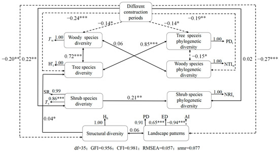 The structural equation model (SEM) shows the complex associations among species diversity attributes, phylogenetic diversity attributes, structural diversity attributes, and landscape pattern metrics across different construction periods. Standardized coefficients (values near arrows) are shown for each causal path. Solid black lines represent significant positive paths, and dashed black lines represent significant negative paths; the two variables pointed by the double-headed arrows are correlated, labeled as covariance (*** indicate p < 0.001, ** indicate p < 0.01, * indicate p < 0.05).