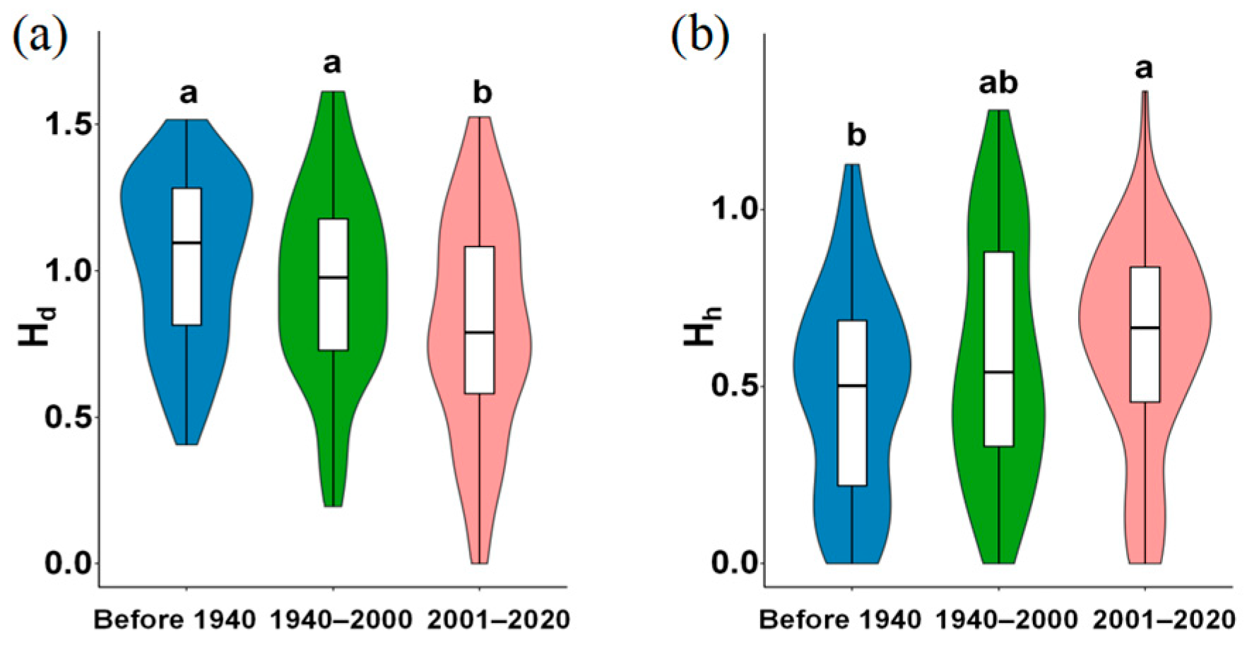 For structural diversity attributes (Figure 3), Hd was the highest in parks constructed before 1940 and lowest in those constructed during 2001–2020, and there were significant differences between before 1940 and 2001–2020 period, and also between 1940 and 2000 and 2001–2020 period (p < 0.05). Hh was the highest in the construction period of 2001–2020 and lowest in the construction period before 1940, and there were significant differences between before 1940 and 2001–2020 period (p < 0.05).