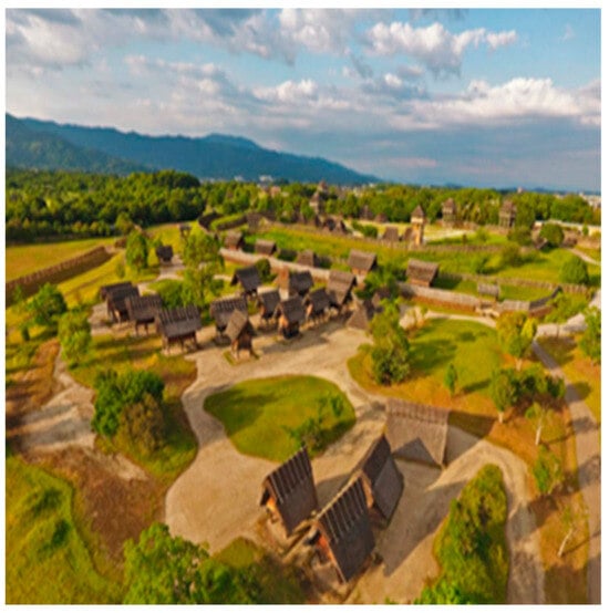 The Yoshinogari site is a large-scale ring-trench settlement site from the Yayoi period (a long period of 700 years) in Japan. It is of great cultural, historical, and social value as it reveals the beginnings of the early primitive state of Japan [68]. Yoshinogari Historical Park is a national park of monumental significance that was built for the preservation and active use of archaeological sites. It preserves the surrounding rich natural environment and the site as a whole, respecting the role of these archaeological sites and historical places in contemporary society. It also builds a space that the public can easily use to promote public understanding of the site’s culture and recognition of its value. Yoshinogari Park has become a significant place for promoting national culture and a stronghold for transmitting cultural information from Japan to the world by creating an overall landscape with the atmosphere of the Yayoi era, as shown in Figure 1 and Figure 2.