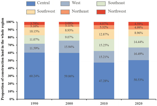 Proportion of construction land in regional basins.
