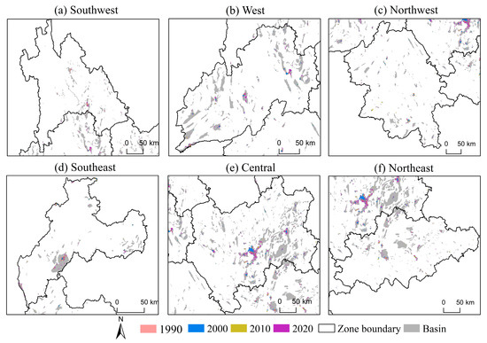 The urban construction land area in Yunnan Province has experienced continuous growth, from 424.49 km2 in 1990 to 3017.68 km2 in 2020, indicative of rapid urbanization. Notably, 85% of this expansion occurred within basins. Overall, the amount of urban construction land in basins has increased, with distinct regional variations in expansion patterns (Figure 2). In terms of proportional growth, Central Yunnan displays a decreasing trend, whereas Western, Northwestern, Southeastern, and Northeastern Yunnan exhibit increasing trends. Initially, in 1990, urban construction land was primarily concentrated in basins hosting city centers. From 1990 to 2000, new urban construction land mainly emerged in the Dianchi, Dali, Lijiang, and Zhaolu basins, with sporadic expansions in other basins. Between 2000 and 2010, urban construction land expanded rapidly across multiple basins, particularly in the Zhaolu, Mengzi, Wenshan, Zhongdian, Baoshan, Ruili, Dali, Simao, Jinghong, Dianchi, and Chuxiong basins. From 2010 to 2020, the direction and scope of urban construction land expansion became more dispersed, with an increase in scattered land patches across smaller basins (Figure 3).
