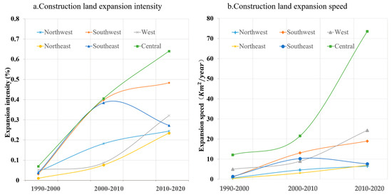 Expansion intensity and speed of construction land in basins.