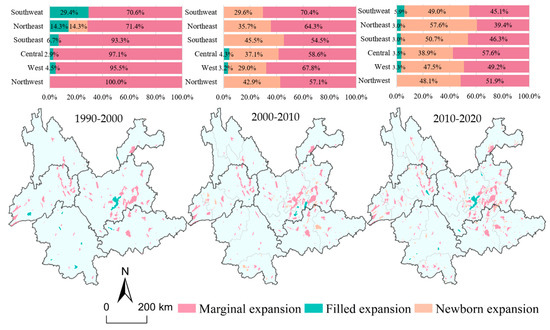 - Edge expansion has been the dominant mode throughout all periods, constituting over 50% in most regions. Since 2000, new expansion has become particularly prominent in Northeastern, Southeastern, and Southwestern Yunnan.