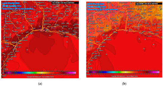 Forecasted ground temperatures from the AROME model for central Liguria: (a) Maximum temperatures for Monday, 29 July 2024, 3:00 p.m. (b) Minimum temperatures for Tuesday, 30 July 2024. Temperatures at 2 m (°C) with isotherms. (AROME 1.3 km 06Z, 07/28/2024). Source: https://www.meteociel.fr/modeles/aromezoom.php?mode=41&x=10372.61&y=7505.73&ech=5&zoom=3.4, accessed on 20 December 2024.