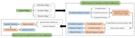 This study selects three typical villages in different locations in Hebei Province of China and first carries out multi-function evaluations of rural settlements by establishing an evaluation indicator system and adopting methods of coordination degree, dominance degree, and obstacle factor diagnosis to clarify the differences in rural settlement functions for different types of villages. Then, based on the present status of land use and function demands of the different villages, this paper simulates the future internal land use structure of rural settlements by combining the Markov model and CLUE-S model (Figure 1). The research results of this paper provide specific and differentiated directions for further optimizing land use structure and improving service functions for three rural settlements located in different regions of Hebei Province with significant development differences. They indicate that this research has certain universal applicability and can provide reference ideas and methods for land optimization for other rural settlements at different stages of development in the future. In theory, this study further enriches the research perspective of rural settlement optimization and regulation by constructing a multi-functional-oriented framework for optimizing rural settlement land use. In application, this study is the first to combine the Markov model and CLUE-S model at the settlement scale to conduct land optimization research, which can provide technical reference for village planning and rural land consolidation in the future.