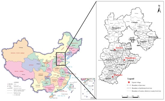 Hebei Province is a typical agricultural and rural province in China, with a vast rural area, active rural economy, large rural population, and developed agriculture. In addition, Hebei is the province with the most complete topography in China, and its rich types of land resources lead to significant differences in regional development and utilization, which is conducive to comprehensively analyzing the spatial differentiation laws in the process of rural settlement development. Therefore, against the background of urban–rural integration development, this study selects three rural settlements with significant development differences in different regions of Hebei Province (Figure 2).