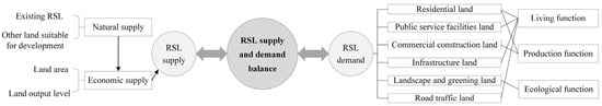 Rural settlement land results from the interaction between land supply and land demand [31] (Figure 3). The supply of rural settlement land is usually divided into two categories: natural supply and economic supply. Natural supply refers to the amount of land that is naturally formed and available for farmers to use, including rural settlement land that has been used and land reserve resources that can be used in the future. Economic supply refers to the effective land supply that is developed through labor input on the basis of natural supply, which farmers can directly use for production and life. Its increase mainly comes from the growth of the rural settlement land area or the output level of rural settlement land per unit area. The demand for rural settlement land is the demand for rural residents to perform various consumption activities using rural settlement land for survival and development [42]. Various types of rural settlement land play different functions to meet the needs of rural residents in life, production, and ecology. The living function is mainly carried out by residential land, public service facilities land, infrastructure land, and road traffic land, which provide the space for rural residents’ daily work, rest, and communication. The production function includes two parts: the agricultural production function and non-agricultural production function. The agricultural production function is generally carried out by the yards of residential land or idle residential land, which provides space for farmers to plant, breed, and dry and store grain. The non-agricultural production function is mainly carried out by residential land and commercial construction land [43], which provide space for rural residents to engage in self-employed business, services, and handicrafts or industry. The ecological function is mainly carried out by landscape and greening land, which provides space for beautifying the rural living environment and controlling rural environmental pollution [44].