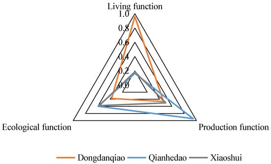 The analysis results of the dominance degree are shown in Table 2. Regarding living function, Dongdanqiao has a significant advantage (dominance degree > 1.5); Qianhedao and Xiaosui do not reach the average level (dominance degree < 1). Regarding production function, only Qianhedao exceeds the average level (dominance degree > 1), and its agricultural and non-agricultural production functions are near the average level (dominance degree ≈ 1). Both Dongdanqiao and Xiaoshui reach the average level; the former has certain advantages in non-agricultural production function but lacks agricultural production function, and the latter has significant advantages in agricultural production function, but its non-agricultural production function does not reach the average level. Regarding ecological function, only Xiaoshui exceeds the average level, while Dongdanqiao and Qianhedao do not reach the average level, and the former’s disadvantage is more obvious.