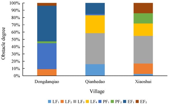 The results of obstacle factor diagnosis are shown in Figure 5. The main obstacles to the settlement functioning of Dongdanqiao are per capita farmland area (PF1) and per capita landscape and greening land area (EF1). The village should try to improve the agricultural production scale and strengthen the construction of ecological land in the future. The main obstacles to the settlement functioning of Qianhedao and Xiaoshui are the perfectness of infrastructure (LF3) and road coverage (LF4). The two villages should strengthen the construction of life service facilities in the future. In addition, the obstacles to the settlement functioning of Qianhedao also include the proportion of house reconstruction (LF1) and the per capita landscape and greening land area (EF1). In the long run, the village should improve the living environment and increase the greening land. The obstacles to the settlement functioning of Xiaoshui also include the perfectness of public service facilities (LF2), the proportion of non-agricultural employment (PF2), and the air quality index (EF2). In the long run, the village should construct infrastructure, develop non-agricultural industries, and improve the service functions of ecological land in the village.