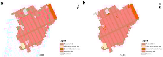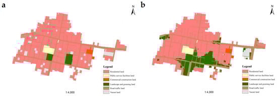 The simulation results of the spatial structure of rural settlement land in Dongdanqiao in 2030 are shown in Figure 6b. Compared with the land use conditions in 2020 (Figure 6a), there are several changes in the future land layout of the settlement: (1) Part of the vacant land in the north of the settlement, which has a high slope and is inconvenient for farmers’ lives, will be transformed into commercial construction land for developing agricultural processing or the service industry and improving agricultural production capacity. (2) Part of the vacant land will be transformed into residential land for the approval of new homesteads, and part of the scattered residential land will be vacated as vacant land or transformed into public service facilities land to improve the intensive use of rural construction land. (3) To ensure the normal operation of the model, the simulation process did not involve landscape and greening land, which was nonexistent at that time, and infrastructure land, which was only 10 m2. However, they can be developed from vacant land or road and traffic land in the future to improve the ecological and living functions of the settlement.