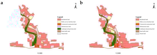 Due to the relatively scattered distribution of rural settlement land in the exurban and remote villages, grid data with an accuracy of 1 m were used to simulate the spatial pattern of rural settlement land in Qianhedao and Xiaoshui. According to the calculation, the Kappa coefficient of the spatial structure simulation of rural settlement land in Qianhedao in 2020 is 0.8328, which means the simulation result is good. The simulation results of the spatial structure of rural settlement land in 2030 are shown in Figure 7b. Compared with the land use conditions in 2020 (Figure 7a), there are several changes in the future land layout of the settlement: (1) A large number of scattered vacant land in the settlement will be transformed into residential land, and part of the scattered residential land will be vacated as vacant land to promote the contiguous use of residential land, facilitate the unified layout of living service facilities, and improve farmers’ living standards. (2) A large amount of landscape and greening land will be developed in the low-lying areas, such as surrounding ponds, to improve the ecological function of the settlement. (3) To ensure the normal operation of the model, the simulation process did not involve infrastructure land, which was nonexistent at that time. However, it can be developed from vacant land in the east of the settlement in the future to improve the living function of the settlement.