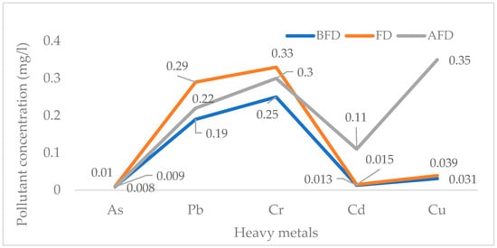 However, the mean values of the copper pollutant found in Osun River were below the permissible levels of 1.0 mg/L set by the NESREA and 2.0 mg/L set by the WHO. The mean value of 0.031 mg/L was obtained before the festival day, 0.039 mg/L was observed on the festival day, and 0.35 mg/L (the highest) was obtained after the festival day. Thus, during the time of this study, the quantity of copper in Osun River was not excessive, and was safe for human consumption without any health threats. Furthermore, the order of the presence of heavy metals in Osun River followed the same pattern BFD and during FD, with Cr > Pb > Cu > Cd > As, while that AFD was Cu > Cr > Pb > Cd > As (Table 1).