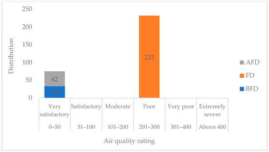 Similarly, the level of air pollutants (formaldehyde) in OSG was lower than the permissible level of 0.02 mg/m3 provided by both the NESREA and WHO. Regarding HCHO, BFD was observed to have the highest mean value at 0.01 mg/m3, followed by FD with 0.005 mg/m3, and AFD was observed to have the lowest mean value at 0.004 mg/m3. However, particles of 2.5 microns (PM2.5) and 10 microns (PM10) in the air in OSG BFD (24 µg/m3 and 31 µg/m3) were within the permissible levels provided by the NESREA at 40 µg/m3 and 150 µg/m3, respectively. Similarly, the obtained mean values of particulate matter of 2.5 and 10 microns (PM2.5 and PM10) AFD were 30 µg/m3 and 39 µg/m3, respectively, which were healthy and lower than the minimum permissible levels of 40 µg/m3 for PM2.5 and 150 µg/m3 for PM10 provided by the NESREA. However, the mean values of both PM2.5 and PM10 during FD were 182 µg/m3 and 238 µg/m3, respectively, which are unhealthy for humans after prolonged exposure and above the limits set by the NESREA. Meanwhile, the mean values of particulate matter (PM2.5) BFD, during FD, and AFD were 31 µg/m3, 182 µg/m3 (extremely high), and 30 µg/m3, respectively, which were above the permissible limit of 45 µg/m3 set by the WHO. However, only the PM10 obtained during FD (238 µg/m3) was found to be above the permissible level of 45 µg/m3 set by the WHO. It can be deduced from Table 1 that the level of air pollution with PM2.5 and PM10 on the festival day was unhealthy, and long exposure could cause severe respiratory disorders in humans.