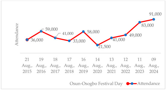 - National Commission for Museums and Monuments. Visitors statistics from year 2015 to 2024; National Commission for Museums and Monuments: Osogbo, Nigeria, 2024. [Google Scholar]