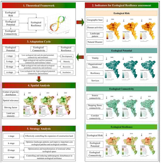 Urban agglomerations are collections of cities with transportation, production, information, technology, and culture at the core. They are a concrete manifestation of spatial agglomeration, linkage, and centrality of population density and land-use types. A complex and dynamic urban agglomeration ecosystem exhibits multi-stability and dynamic development characteristics [1]. Urban agglomerations face long-term, complex risks that exacerbate vulnerabilities and disrupt self-regulation [2,3]. Landscape ecological resilience is an important indicator for preserving ecosystem structure, function, and quality. The concept of “evolutionary resilience” focuses on a system’s ability to withstand perturbations and risks, self-adjust, and adapt after impacts [4,5,6,7]. Adaptive cycling theory, an important model for resolving the problems of complex systems, includes four cyclic processes (development, protection, release, and restructuring) and three attributes to characterize potential, connectivity, and resilience [8,9,10]. Given that resilience attributes are interrelated and the influence of each factor cannot be analyzed independently, analyzing the dynamic characteristics of landscape ecological resilience from the perspective of the adaptive cycle provides a more comprehensive understanding [11]. Therefore, based on landscape ecology theory, this study comprehensively considers the diversity, dynamics, and complexity of nature-society-ecology, analyzes the dynamic changes in system attributes, and identifies the development stages in different regions. It provides a foundation for comprehending the interactions between nature, society, and ecology, and offers a scientific viewpoint to support the sustainable development of urban agglomerations [12].