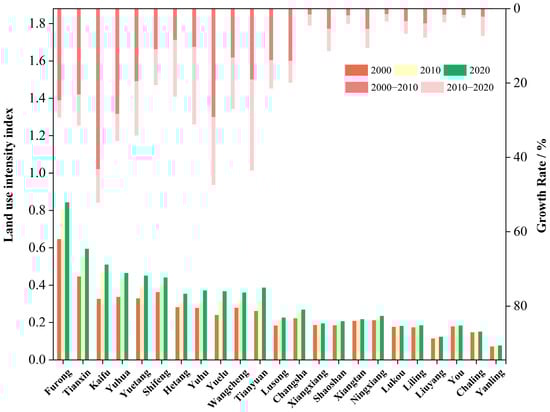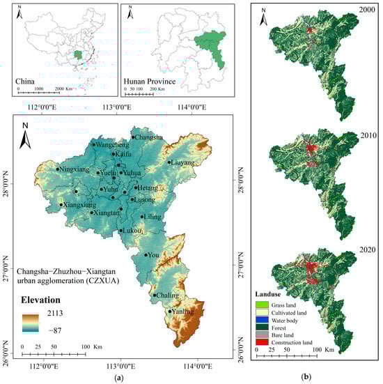 CZXUA is located at 26°03′ N–28°40′ N, 111°53′ E–114°15′ E. It includes basins and hills interspersed with towns and villages. CZXUA is characterized by a unique ecological pattern and presents a spatial structure of “one main and two sub-centers around the green center”, with Changsha as the main core, Zhuzhou and Xiangtan as the sub-centers, and the combined area of the three cities as the green center (Figure 2). A preponderance of mountains can be observed within the western and southeastern regions, the complex topography and ecological environment of CZXUA provide a distinct context for studying landscape ecological resilience. In 2023, CZXUA was predicted to have a total population of 17,066,300 people and an annual gross domestic product (GDP) of 2.07 trillion yuan, accounting for more than 40% of the contribution of the province, making it the region with the most significant changes in urbanization and ecological environment. The urbanization rate increased from 31.88% in 2000 to 73.53% in 2020. The significant expansion of urban areas has encroached upon large portions of ecological land, such as grasslands and forests, leading to landscape fragmentation and the degradation of ecosystem functions, severely threatening the ecological sustainability of the region. Increased.