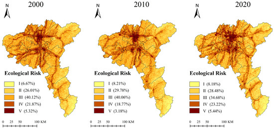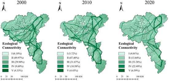 The spatial distribution of the ecological risk, potential, and connectivity indices were all mainly dominated by classes II, III, and IV, with an area share of more than 70%. Compared with 2000–2010, the trend of change in 2010–2020 shows that the ecological risk I and II level areas increased and then decreased, III level areas continually decreased, and IV and V level areas decreased and then increased. This trend may be related to the initial disturbance caused by human activities and the accelerated urbanization process. As a result, the original ecological protective measures are only partially restored. The ecological potential I level area proportion continually increased, II and III level areas first decreased and then increased, and IV and V level areas continually decreased. This trend may be related to transitions between levels, where ecologically healthy source areas are disturbed by human activities, leading to fragmentation of source patches, a decline in habitat quality, and a reduction in biodiversity. The ecological connectivity I and II level areas continually decreased, III and IV level areas continually increased, and V level areas decreased and then increased. This trend may be related to decreasing ecological corridors and increasing stepping stones and connectivity. Overall, the ecosystem of the study area is predominantly in a suboptimal state, experiencing moderate risks while maintaining potential and connectivity for self-recovery. However, if this state persists over the long term, the system may suffer from a lack of high potential and connectivity, leading to an accumulation of system risks and a gradual increase in vulnerability. Therefore, to reduce the risk of collapse in the median region, there is an urgent need to establish a dynamic monitoring mechanism that comprehensively analyses multidimensional attribute characteristics and identifies critical nodes.