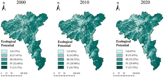 “Potential” refers to the attributes of the ecosystem itself, its ability to meet human development needs and mitigate risk, and its self-repairing and regenerating capacity, which are crucial for the sustainable development of urban ecosystems. Referring to the improved ecosystem health assessment model [53], this study used ecosystem health to characterize the potential of sustainable development of urban cluster ecosystems in combination with ecosystem service functions. The formula is as follows: