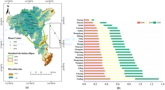 Analysis of the distribution and trajectory of the center of gravity of landscape ecological resilience in CZXUA revealed that the center of gravity of resilience was located in the urban area of Zhuzhou and continuously migrated from the northwest to the southeast, with a gradual slowdown from 2000 to 2020 (Figure 7a). The standard deviation ellipse rotation angle of the center of gravity is approximately 150°, and the direction of the ellipse is consistent with the distribution direction of the main urban area of the urban aggregation. The long axis is approximately twice as long as the short axis, suggesting that the landscape ecological resilience is more widely dispersed in the northwestern-southeastern direction. This feature may be associated with spatially continuous changes in the spatial distribution of landscape ecological resilience in relation to its geographic base (distribution of mountains, and watercourses). Low-grade landscape ecological resilience is mainly distributed in core urban areas because of the high degree of urbanization, pressure of population aggregation, and frequent activities; serious damage to the natural ecosystem; and a decline in the ability of the ecosystem to resist, mitigate, and adapt to risks. As a result, low-resilience zones continue to spread into peripheral areas. The peripheral areas have relatively fewer human interference activities, a better ecological environment background, and higher ecological potential of natural ecosystems such as forests, grasslands, and waters. These are important ecological regulation zones, with stronger stability, self-organization ability, and stronger connectivity in response to external disturbances. Patches of natural habitats are also natural ecological barriers that provide ecosystem services and risk evacuation functions for the core urban area, blocking and buffering the spillover effects of ecological environment pollution and destructive behaviors of the surrounding cities and making the peripheral areas show higher landscape ecological resilience. The landscape ecological resilience levels of districts and counties in CZXUA differed greatly (Figure 7b)., with the highest average value of the resilience index in Yanling County from 2000 to 2020 (0.4433) and the lowest average value of the resilience index in Furong District (0.0589). The landscape ecological resilience indices of Kaifu, Tianxin, and Yutang districts had lower resilience levels, and the rest of the districts and counties fluctuated around the boundaries, with medium and higher resilience levels. Therefore, it should focus on ecological connectivity in the direction of the long axis, strengthen the multi-center group ecological structure, and focus on the change in resilience gradient zone (such as the urban-rural combination), so as to enhance local resilience and gradually realize the coordinated development of ecological protection and economic development.