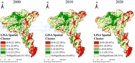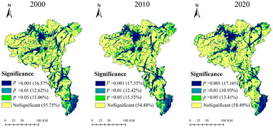 From 2000 to 2020, the landscape ecological resilience of CZXUA showed a stable spatial distribution pattern of “high in the peripheral region and low in the central region”. Analysis of the global spatial autocorrelation of landscape ecological resilience showed that the overall Moran’s index was greater than 0.75, showing an increasing trend. This indicates that the spatial clustering trend improved and there is a more significant positive correlation between landscape ecological resilience during the study period. There was a relatively stable distribution of high and low clustering of the landscape ecological resilience index in the region, and the spatial distribution had obvious heterogeneity. Based on this, we further analyzed the local spatial autocorrelation of landscape ecological resilience (Figure 8) and found that the “high-high” agglomeration was distributed in Liuyang, You, Chaling, and Yanling, and other marginal counties in the form of ecological sources and corridors in the form of patches in the peripheral mountainous areas, and the land use was dominated by forest. This agglomeration area will generate spillover effects on the surrounding ecosystems, thereby enhancing the overall stability of the regional ecosystem and identifying clear focal areas for ecological protection. As such, it is crucial to strengthen differentiated management and foster cross-regional cooperation in both ecological protection and regional development to ensure the coordinated conservation of the ecosystem. The “low-low” landscape ecological resilience agglomeration area was mainly distributed in the core area of the urban agglomeration in the form of pieces or clusters and is dominated by construction land. This agglomeration area may be linked to the expansion of construction land, which compresses ecological space and rapidly fragments natural habitats, resulting in the spread of low-value areas. Uncontrolled expansion exacerbates risks to regional ecosystems, economic development challenges, and spatial equity imbalance, ultimately becoming a source of ecological risk and diminishing overall ecological resilience. Therefore, it is crucial to curb the unplanned expansion of construction land in this region, implement gray-green infrastructure to prevent the spread of low-value areas and establish ecological protection buffers to reduce human-induced disturbances. These measures will help address the challenges posed by the concentration of low-resilience areas on the sustainable development of the ecosystem. There are also “low-high” or “high-low” agglomeration characteristics in local areas. The agglomeration areas passed the significance test (p < 0.05) and the distribution of significant areas (p > 0.001) was concentrated in the central core urban areas and the southern fringe districts and counties, showing an expansion trend (Figure 9). This trend suggests that peripheral areas, influenced by the core urban zones, are gradually facing increasing ecological risks as transitional zones of resilience. These areas may become hotspots where ecological potential is impaired, and habitat connectivity is reduced. Therefore, for these areas, it is crucial to implement a development strategy that promotes both conservation and growth, tailored to the specific conditions of the urban-rural interface, to mitigate spatial polarization. By combining the global and local spatial clustering patterns, it can be seen that the overall spatial autocorrelation of landscape ecological resilience in the study area increased, and the spatial clustering and the trend of significance also increased. This trend may be linked to concentrated economic development or policies such as ecological protection redlines and restricted protected areas, which promote the concentration of high-value regions. To address this, differentiated management should be implemented based on the concentration of resilience, thereby reducing governance costs. Additionally, continuous monitoring of resilience trends should be established, along with an early warning system to identify key factors, ensuring the long-term and effective protection of ecological resilience.