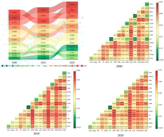 The spatial differentiation of landscape ecological resilience in the complex ecosystems of urban agglomerations is influenced by a variety of factors. The following were selected for this study: geographic basis (Soil, Slope, Rise and Fall (TR), Topographic Location Index (TI) and Elevation (DEM)), Meteorological factors (surface temperature (LST) and rainfall (PRE)), landscape patterns (landscape disturbance index (EI) and net primary productivity (NPP)) and human activities (gross domestic product (GDP) per capita, land use intensity (LDI), nighttime lighting (NTL), population agglomeration pressure (PDI), PM2.5, and traffic pressure index (TDI)) with 15 indicators in 4 categories of elements. Geodetector was used to analyze the drivers of the spatial divergence of landscape ecological resilience in CZXUA from 2000 to 2020, and the degree of explanation of every single factor and factor interaction was determined (Figure 10). The results showed that the degree of explanation for landscape ecological resilience varied greatly among the factors, and the explanatory power was LDI, TI, PDI, DEM, NPP, PM2.5, TR, Slope, LST, PRE, GDP, Soil, TDI, NTL, and EI, in descending order. The average explanatory power of the geographic base was 0.2674, with the topographic location index explaining the highest degree of this factor (q-value of 0.3652) and the soil type explaining the lowest degree of this factor (q-value of 0.1669). The average explanatory power of human activities was 0.2457. This factor had the highest degree of explanation in the land-use intensity index (q-value of 0.3662) and the lowest degree of explanation in nighttime lighting (q-value of 0.1325). The average explanatory powers of the meteorological factors and landscape patterns were 0.2096 and 0.1625, respectively. Among all the factors, the q-value of land use intensity was the largest and showed an increasing trend. The nighttime lighting index, PM2.5, and traffic pressure index also gradually increased, indicating that the spatial distribution pattern of resilience is predominantly influenced by human activities and geographic base, with the influence of human activities exhibiting an upward trend. In the future, efforts to enhance resilience must be meticulously coordinated with human activities, taking into account the constraints imposed by geographic factors. This approach should be complemented by a systematic monitoring and analysis of emerging variables, such as PM2.5 levels and traffic pressure, to ensure a comprehensive and nuanced understanding of the evolving environmental context. Analysis of the interaction detection results of the driving factors of landscape ecological resilience revealed that the explanatory power of the factor combination interaction on landscape ecological resilience was significantly higher than that of a single factor and showed an upward trend. The interaction between land use intensity and topographic position index had the highest degree of explanation of landscape ecological toughness and showed an upward trend. Traffic pressure and nighttime lighting interaction showed the most significant increase, and the interaction of landscape disturbance index and rainfall showed the most significant decrease in the explanation of toughness. It can be seen that the joint effect has an increasing influence on spatial differentiation: the joint effect between human activities and other factors has a stronger explanatory power for the spatial distribution of resilience compared to other factors, and the explanatory power of a single factor of resilience in the human activities and geographic basis is stronger than that of a single factor in the meteorological factors and landscape pattern. It can be seen that the joint effect of the driving factors has gradually become the core factor affecting resilience, the conflict between the interference of human activities and the constraints of the geographic base has been intensified, the compound effect of infrastructure construction (transport roads) and economic development has been strengthened, and the system self-recovery mechanism has been weakened in the context of climate change. Therefore, in order to enhance ecological resilience, it is necessary to take complex systems as the basis, focus on the transformation of ecological development and construction, identify the key nodes of changes in the compound factors, and gradually realize the system self-recovery and sustainable development.