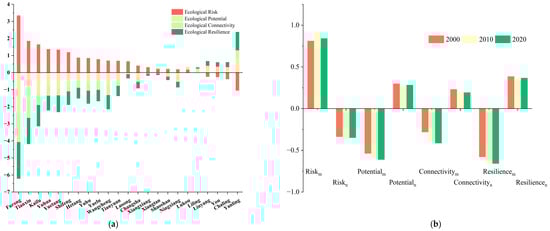 This study counted the three-dimensional eigenvalues of “Potential-Connectivity-Resilience” in each district and county of the CZXUA and analyzed the differences in the spatial three-dimensional eigenvalues of the regions based on the ecological risk (Figure 11a). Comparisons among the spatial distributions of ecological risk, potential, connectivity, and resilience revealed that the core urban areas had larger ecological risk values and lower potential, connectivity, and resilience values, whereas the marginal districts and counties had smaller ecological risk values and higher potential, connectivity, and resilience values. Furong, Tianxin, Kaifu, Yuhua, Yutang, Shifeng, Yuhu, Yuelu, Wangcheng, Tianyuan, Lusong, and Changsha counties had the highest ecological risk values and the lowest potential, connectivity, and resilience values. Xiangxiang County, Xiangtan County, Shaoshan City, Ningxiang County, and Lukou District had higher ecological risk values and lower potential, connectivity, and resilience values. Liling City, Liuyang City, You, and Chaling Counties had lower ecological risk values and higher potential, connectivity, and resilience values. Yanling City had the lowest ecological risk values, higher potential, connectivity, and highest resilience values. In terms of the “Center-Edge” circle structure, the landscape ecological resilience eigenvalues of the metropolitan and non-metropolitan areas in the CZXUA were distributed in the opposite direction (Figure 11b). The metropolitan area showed large changes, with fluctuating increases in ecological risk and decreasing trends in potential, connectivity, and resilience, whereas the non-metropolitan area showed smaller changes, with insignificant changes in ecological risk, potential, connectivity, and resilience.