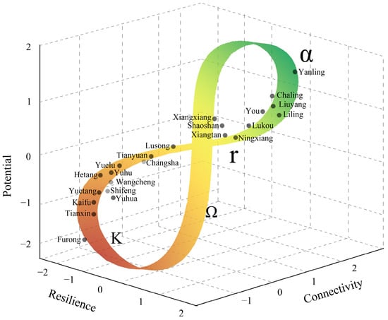 Combined with the adaptive cycle model, identify the adaptive dynamics of landscape ecosystems based on the three-dimensional spatial coordinates of “potential-connectivity-resilience” and the eigenvalues of each county (Figure 12). In this study, thresholds of −1 and 1 were selected [70]. If the three-dimensional characteristic values fell within the range of −1 to 0, they were considered to be in the protection phase (K phase). If all values were greater than 0, they were in the reorganization phase (α phase). If the values were between −1 and 1 and showed a decline, they were in the development phase (γ phase). If all values were less than −1, they were in the release phase (Ω phase). As can be seen, Furong, Tianxin, and Kaifu districts and Yuhua, Yutang, Shifeng, Yuhu, Yuelu, Wangcheng, Tianyuan, Lusong, and Changsha counties were in the protection phase (k). Economic development was in a high state, with high-risk values, low potential, connectivity, and resilience values. The landscape ecosystems were beginning to enter an upward state from the lowest threshold, indicating that these areas entered a mature and stable stage and were transitioning towards valuing ecological development and mitigating ecological risks brought about by urban construction. Xiangxiang, Xiangtan, Shaoshan, Ningxiang, and Lukou Counties were in the development stage (r), with economic development expanding, ecological risk increasing, and potential, connectivity, and resilience declining. This stage is characterized by urban economic development and expansion of construction land. Liling, Liuyang, You, Chaling, and Yanling counties were in the restructuring stage (α), with low ecological risk and high potential, connectivity, and resilience, driven by the large distance from the economic core area of the urban agglomeration. The impact of human activity interference was small, and the natural basic conditions were superior, with self-repair ability; hence, this stage is manifested in the initial development and construction state. According to the landscape ecological resilience trend during the whole study period, the resilience of the peripheral region increased, the resilience of the core region decreased, and no region reached the release stage (Ω). Peripheral areas move from the development stage into the protection stage as urbanization and regional integration progress. The vulnerability of the urban system is expected to increase, posing a potential threat to regional ecological security and sustainable development. Therefore, urban construction should focus on shifting from quantitative to qualitative changes to improve the quality and stability of ecosystems and increase the ecological resilience of urban landscapes to resist external risks.
