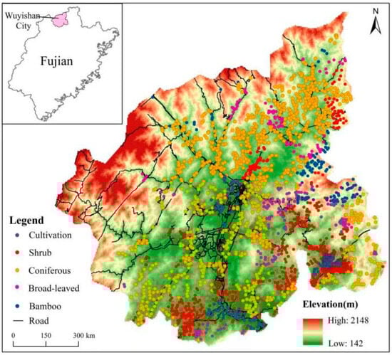 The study area is in the Mount Wuyi of northern Fujian Province, China, covering a total area of 2813 square kilometers. This region experiences a mid-subtropical monsoon humid climate, characterized by distinct seasons, abundant rainfall, an average annual temperature of 19.7 °C, and an average annual precipitation of 1926.9 mm. The area is surrounded by mountains to the east, west, and north, with relatively flat terrain in the central and southern parts (Figure 1). The terrain slopes from the northwest to the southeast, reaching its highest point at Huanggang Mountain, which stands at 2158 m above sea level. Known for its rich biological resources, Mount Wuyi boasts a forest coverage rate of over 80%.